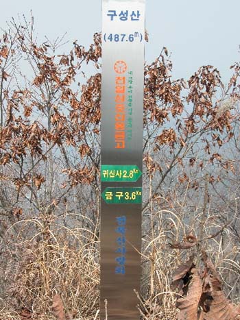 산행시작 50여분만에 임도가 있는 절개지에 다다릅니다. 자그만 암벽을 지나 20여분 바싹 다시 고도를 올리면 전북산사랑회와 매일저축은행에서 설치한 구성산 푯말이 서있는 정상에 도착합니다.