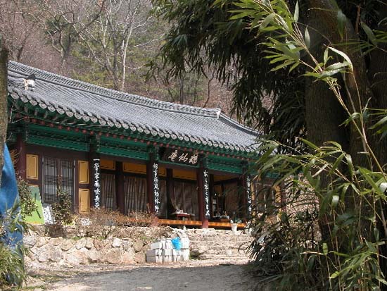 푯말에 금구 3.6Km 귀신사 2.8Km로 표시가 되어있는데 금구방향으로 일단 100여 미터 내려가다가 헬기장 못 미쳐서 왼쪽으로 떨어져야 됩니다. 왼쪽 길로 가다보면 내려가는 듯 하다가 다시 오르막으로 변하면서 암벽이 군데군데 박혀있는 능선길로 내려오게 됩니다. 신우대가 꽉 쩔어 길이 잘 안보이는 몇미터를 뚫고 나가면 의외의 선경 같은 학선암 갑자기 나타납니다.