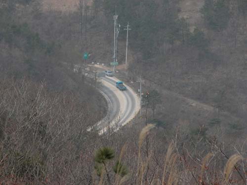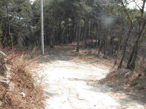 학선암에서 마른 목을 추기고, 시멘트와 흙으로 잘 닦여진 자동차소로로 7-8분 내려오다보면 도로가 오른쪽으로 120도정도 회전하는 내리막이 나오는데 거기서 도로를 버리고 직진으로 편안한 산의 능선길로 접어듭니다.