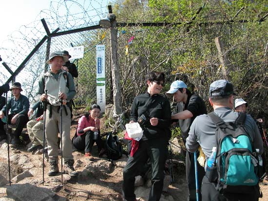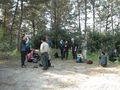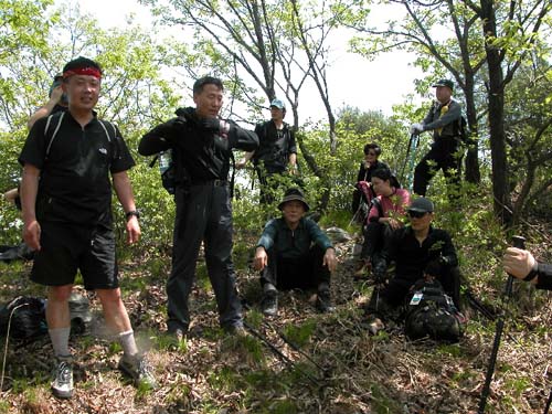 09:43경 북쪽 헬기장에서 (화살표된 3명이 중도 탈락자 사진 찍을 때도 맨 가에 서는게 소극적이더라니..)