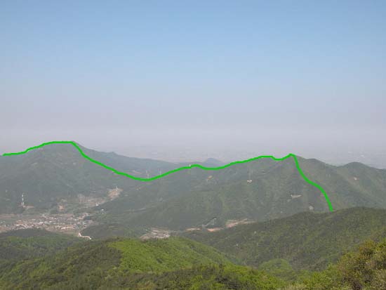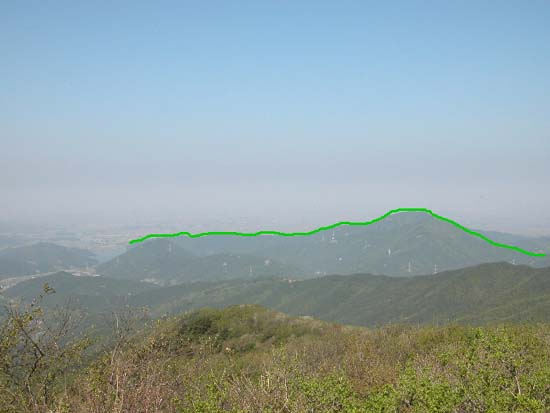 09:50경 북쪽 주능에서 본 유각봉, 삿갓봉, 구성산 (녹색선이 오후에 가야할 등산로)