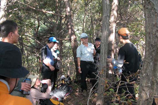 14:15 배재 후미대장에게 전화가 온다(무전기를 가져왔는데 빌려준 ‘조현목’이 충전도 제대로 안 해서 밧데리가 바로 나갔음) ‘장발짱’과 ‘망가’가 안 보이는데 왔느냐 묻는다 ‘어, 안왔는데???’ ‘김덕중(떡판)’ : “어어.. 그럴줄 알았어...일 났다니까?? 눈 빛이 틀리더만...” 잠시 길을 잘못 들어 30여분 공머슴살다가 온다... 그렇지 않아도 힘들텐데.. 오늘 산행에서 둘이 길을 잘못 들어 시간을 지체 했을 뿐 거의 쳐진 사람이 없다 이제 정상까지는 2.4㎞ 남았다 다시 말하면 이제부터 모악산을 새로 올라간다고 생각하면 된다