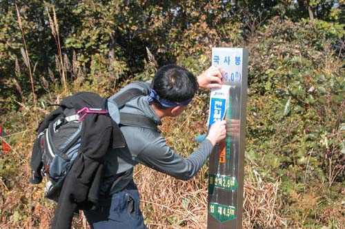 국사봉 정상에 표지판을 고쳐 붙이는 ‘김국진’(전일저축은행 뚜벅산악회 회장)