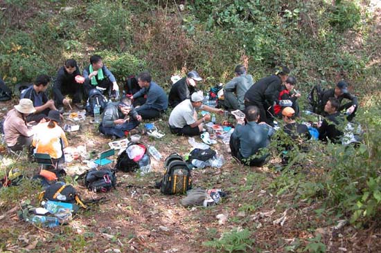 11:34 밤티재에 도착 혹시나 물을 누가 가져가지 않았나 걱정했는데 반갑게 누워있다 멀리 창원에서 온 ‘실리’와 해씨 부부에게 맛있는 도시락을 준비해 줬어야하는데.... 전국체전때문인지 도시락 예약이 불가능하여 김밥으로 떼운게 맘에 걸린다 더구나 ‘해질녘’은 엄청 먹어대는데.... ‘돈키호테1’는 소풍 온 듯 도시락에 별별 것을 다 싸왔다 각시가 새벽 2시부터 준비했다나 .... ‘한지점장’이 건네주는 매실주와 ‘강대장’이 준 홍주, 모두 맛이 기막히다 예상보다 진행이 빨라 점심시간을 충분히 갖기로 했다 ‘만복대’는 지리산에서나 여기서나 바싹 옆에 붙어서 담배 연기로 나를 괴롭힌다