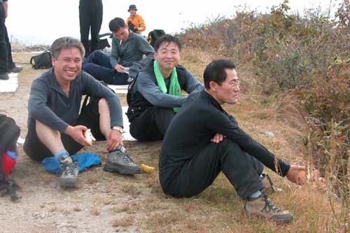 16:30 중인리 푸른집 ‘이한구’ ‘정회원’ 둘은 이미 와서 씻고 있다 산행 내내 선두를 유지하고, 상당히 힘이 좋은 친구들이다 ‘원루삐쓰리껄리’(맥주1+막걸리3)로 갈증을 채우기 시작한다 17:15 후미가 모두 도착한다 이내 모두 얼큰해지고 이제야 돌아가며 한명씩 자기소개를 한다 재홍이 후배인 ‘조정우’는 산행 하루 종일 아무말도 안하다가 술이 얼큰해지자 그동안 못한 말을 한꺼번에 모조리 쏟아놓는다