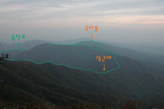 원래는 국사봉쯤에서 점심을 예상했는다 빠르긴 빠르다 중인리 푸른집에 전화를 건다 “아줌마??? 난데요 비사벌막걸리 20병만 씨원하게 얼려놔요..” (하산주 맛으로 산행하는건데 뭐..) 이제 점심 장소를 물 보충장소인 ‘밤티재’로 정해본다 밤티재까지는 거의 뚝~ 떨어지는 내리막이다
