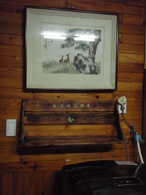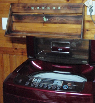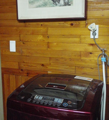 아주머니가 농장 집 세탁기 뒤편에 선반을 하나 만들어 달란다.