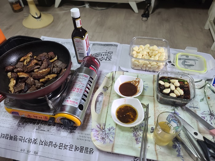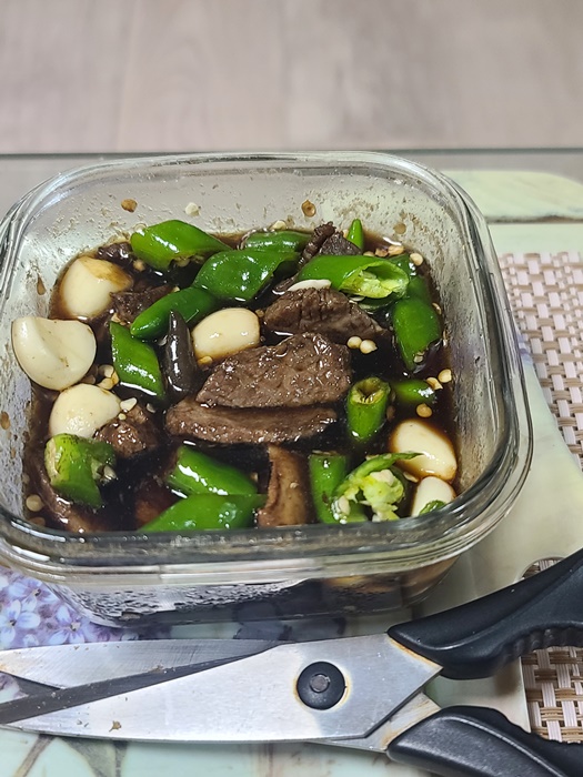남은 고기를 마늘고추 넣은 간장에 다 박았다.